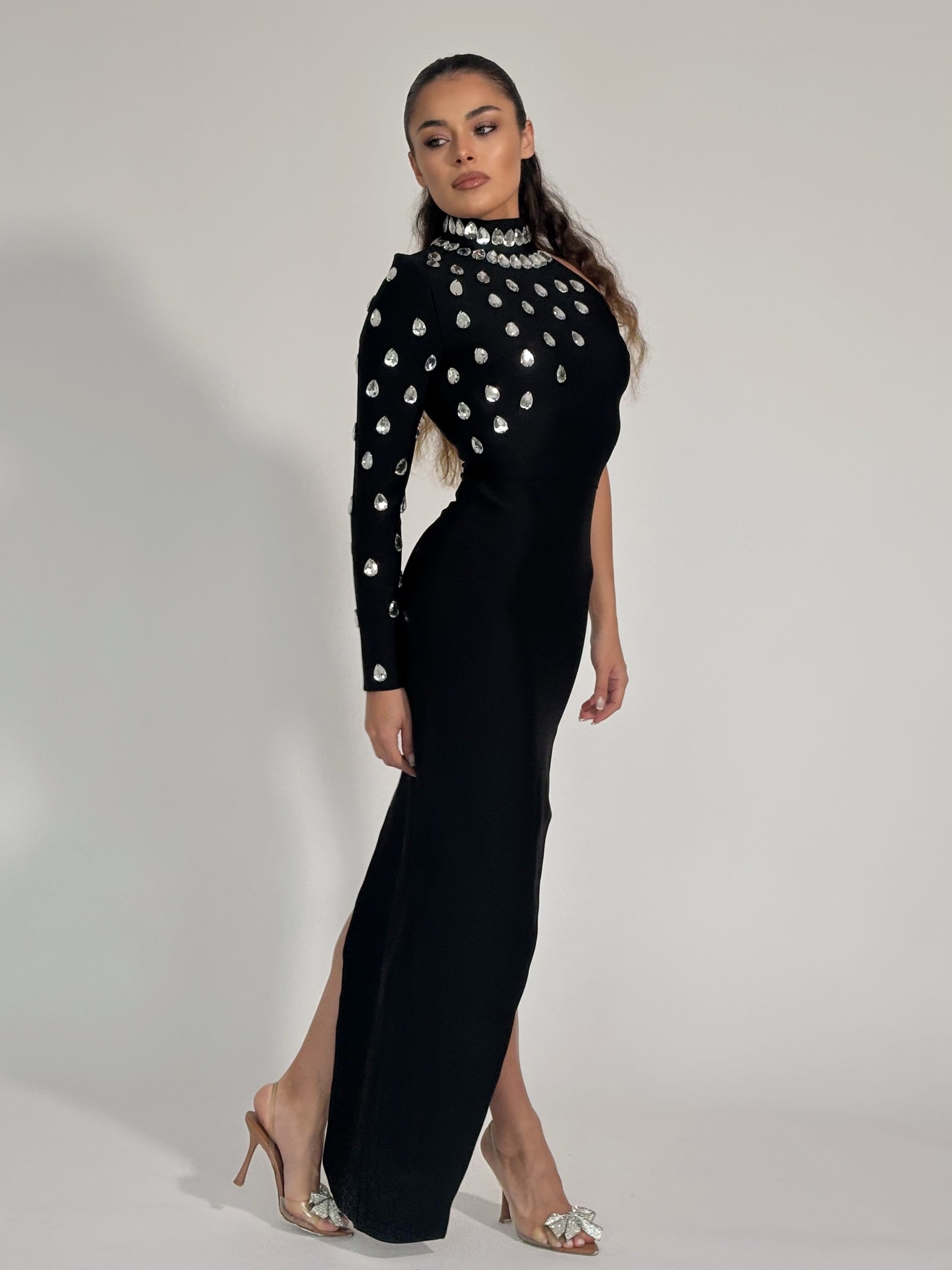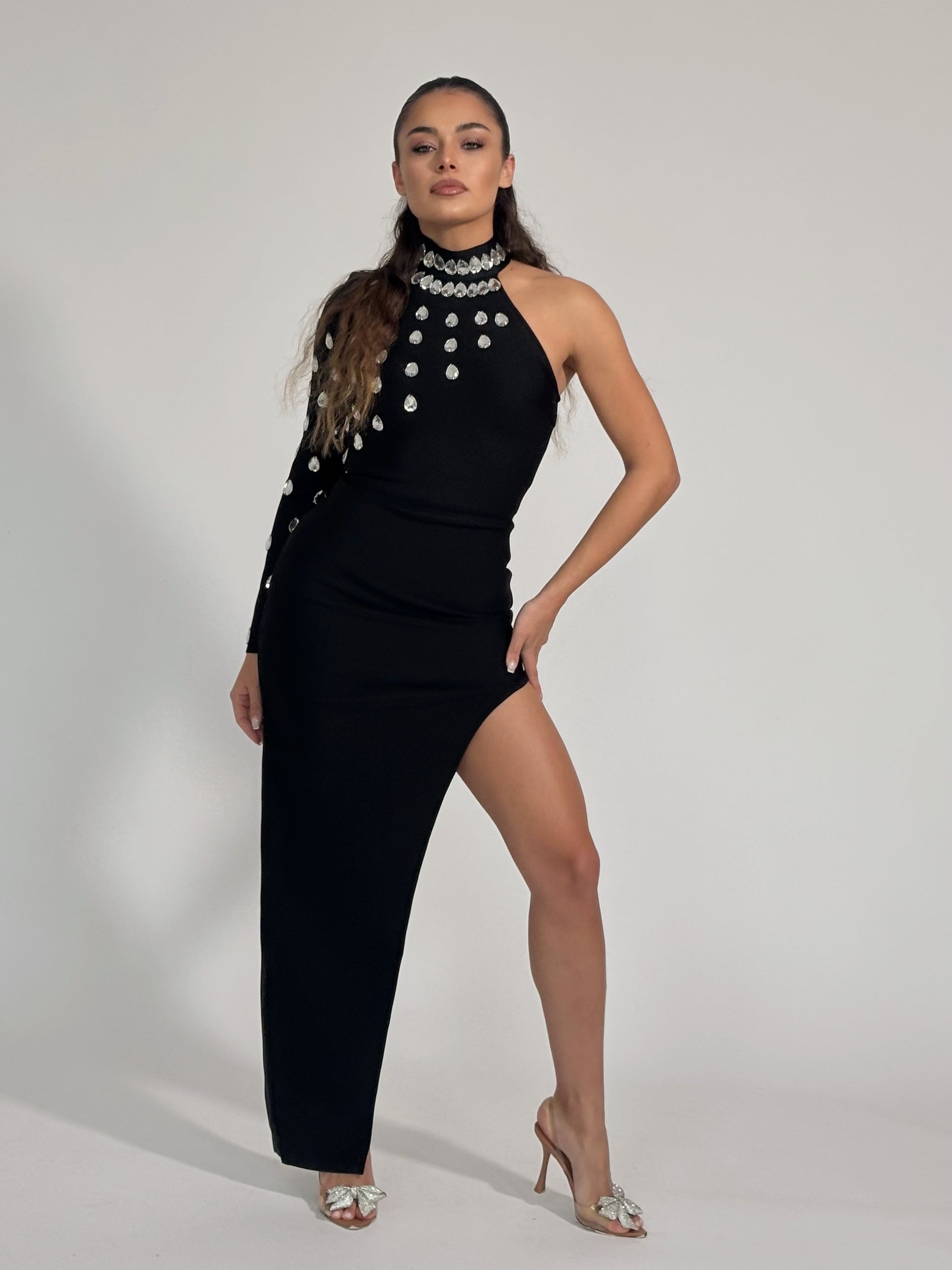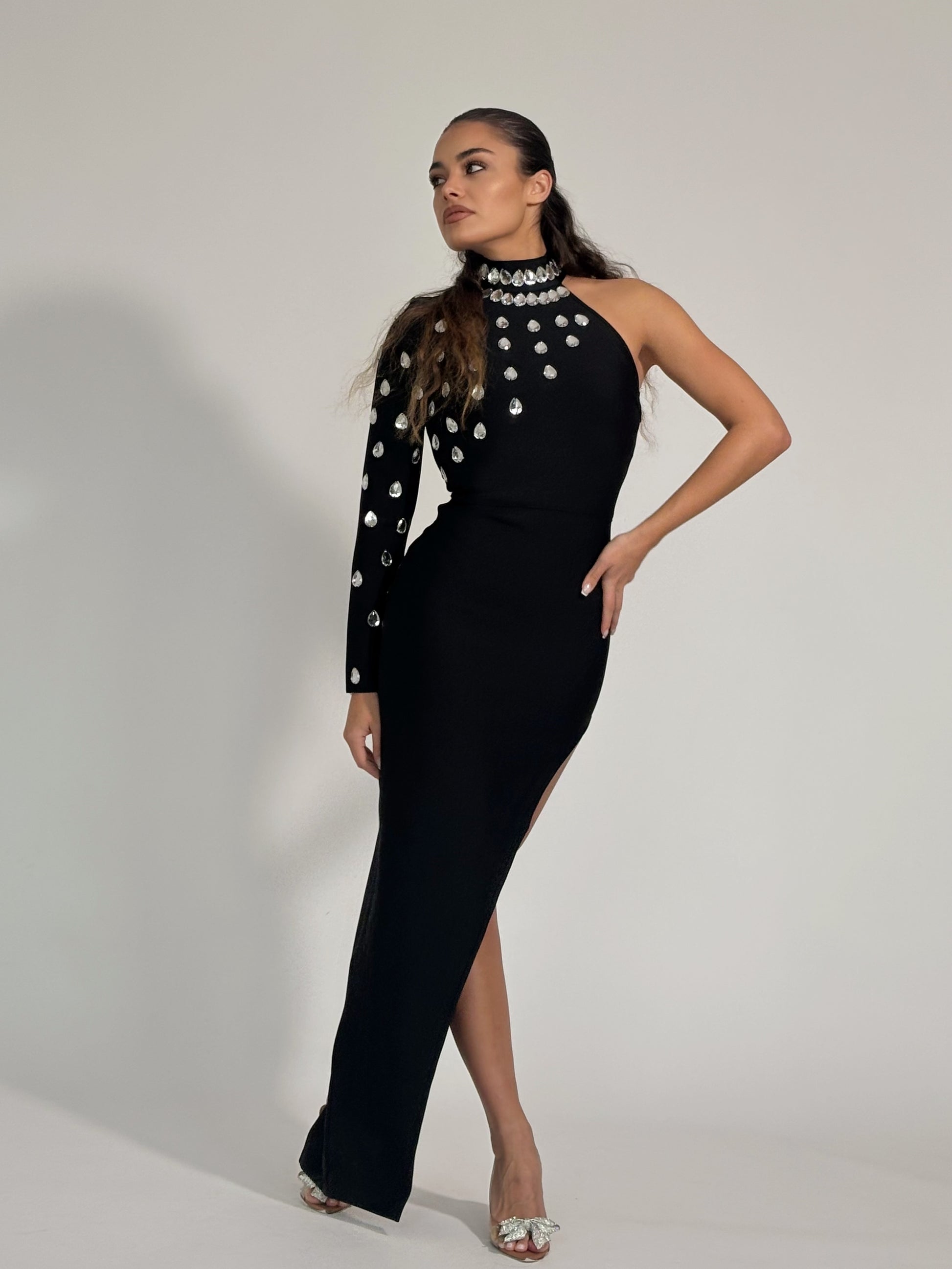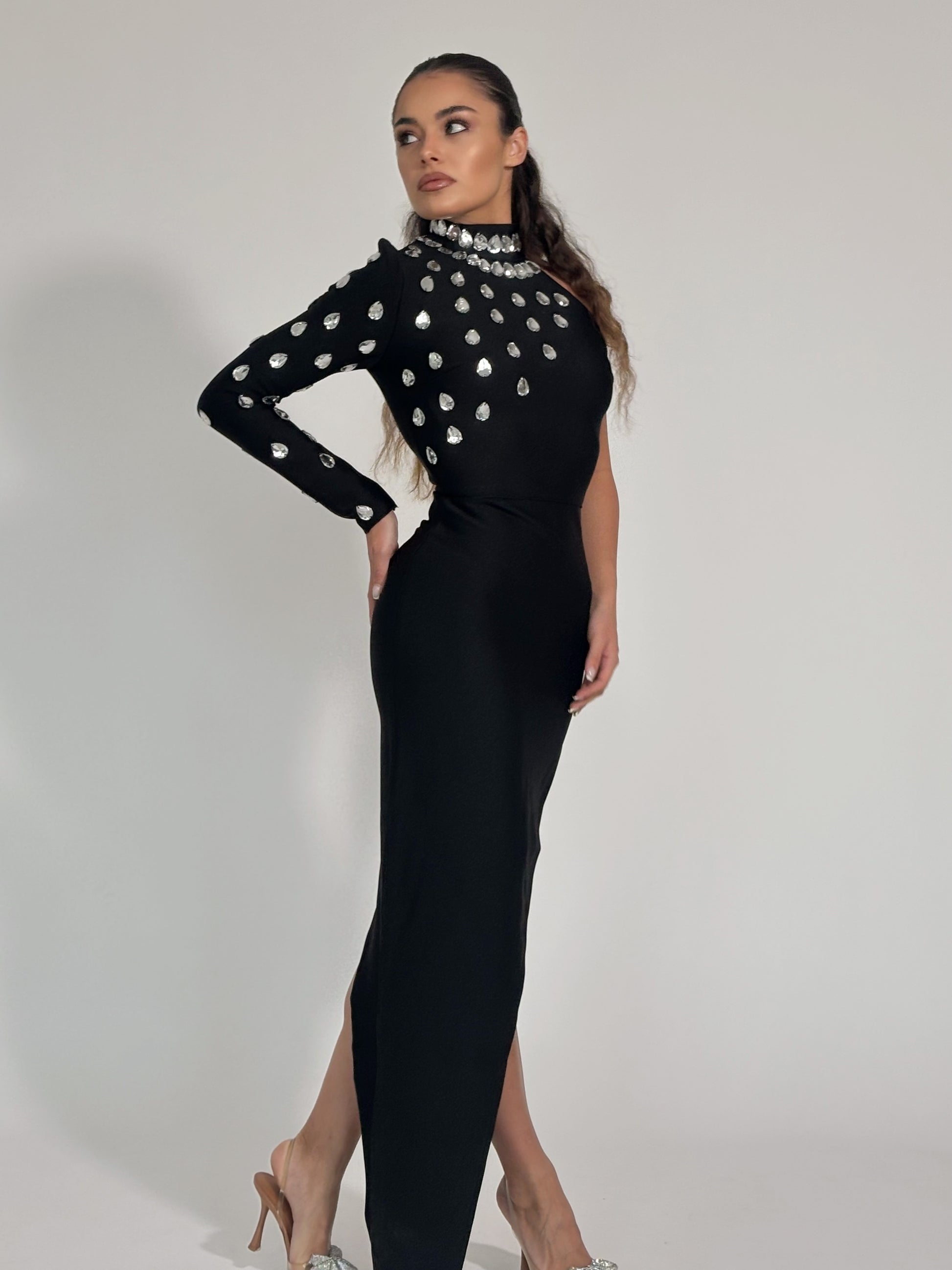 Бандажна рокля Violla с един ръкав и камъни