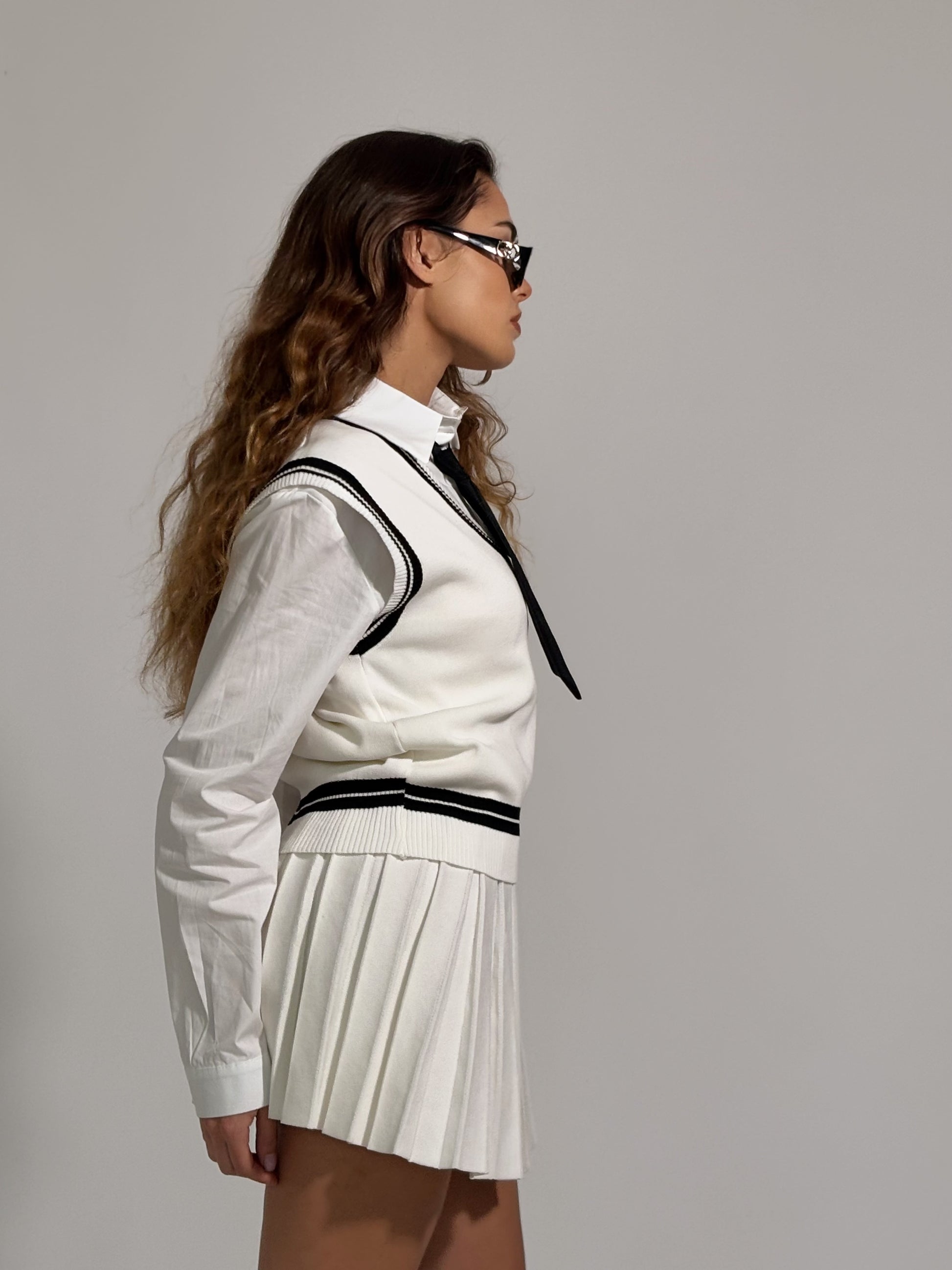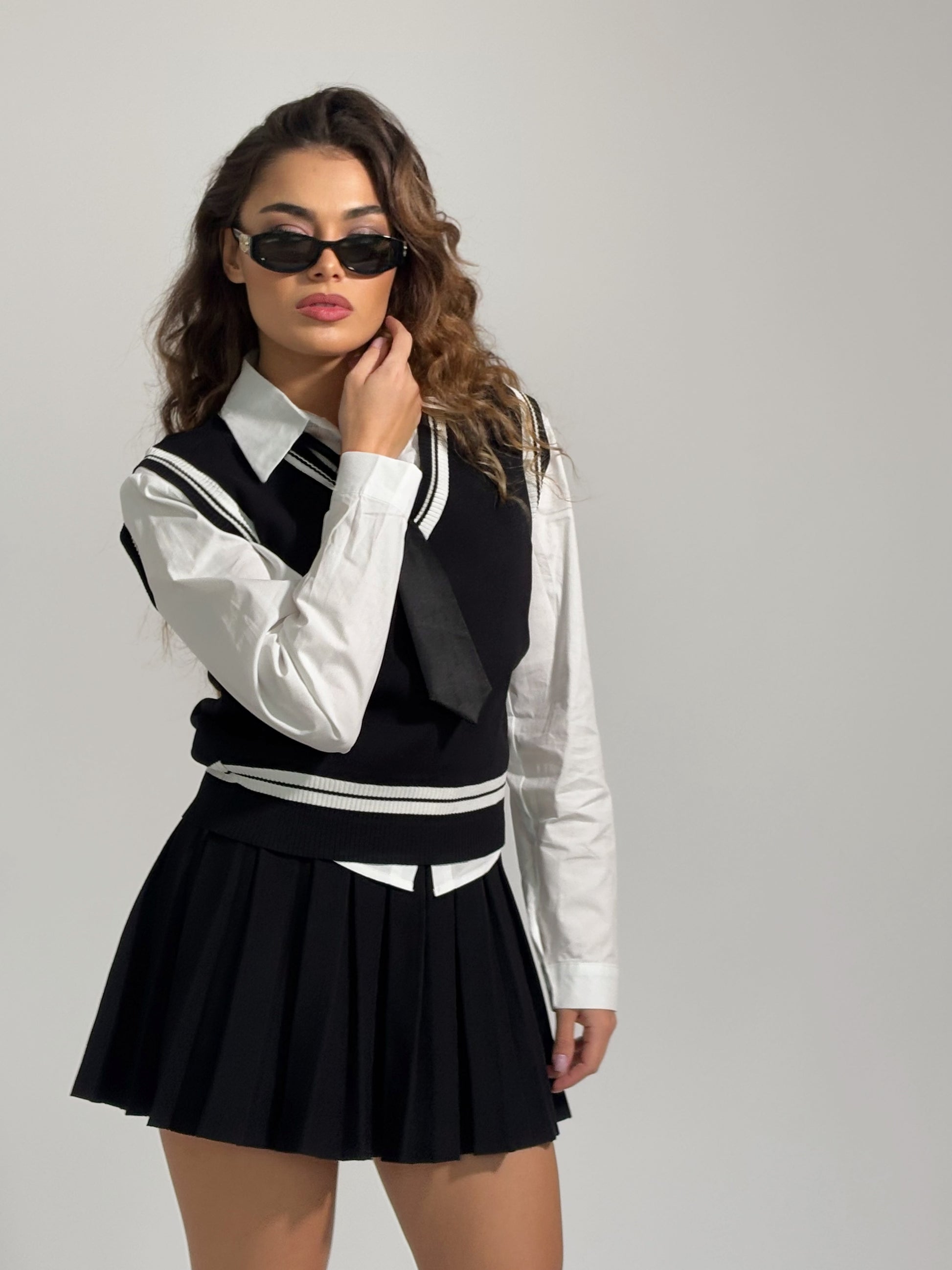 - Комплектът се състои от пола, елек, риза и вратовръзка